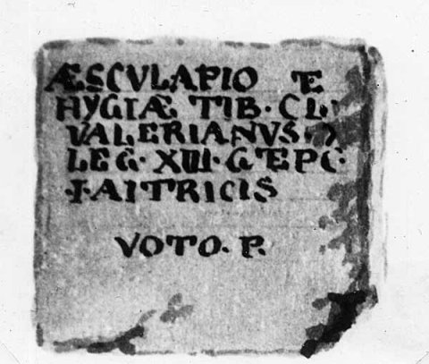 - Aesculapio et / Hygiae Tib(erius) Cl(audius) / Valerianus (centurio) / leg(ionis) XIII G(eminae) et leg(ionis) / I A(d)i(u)tricis / voto p(osuit).
