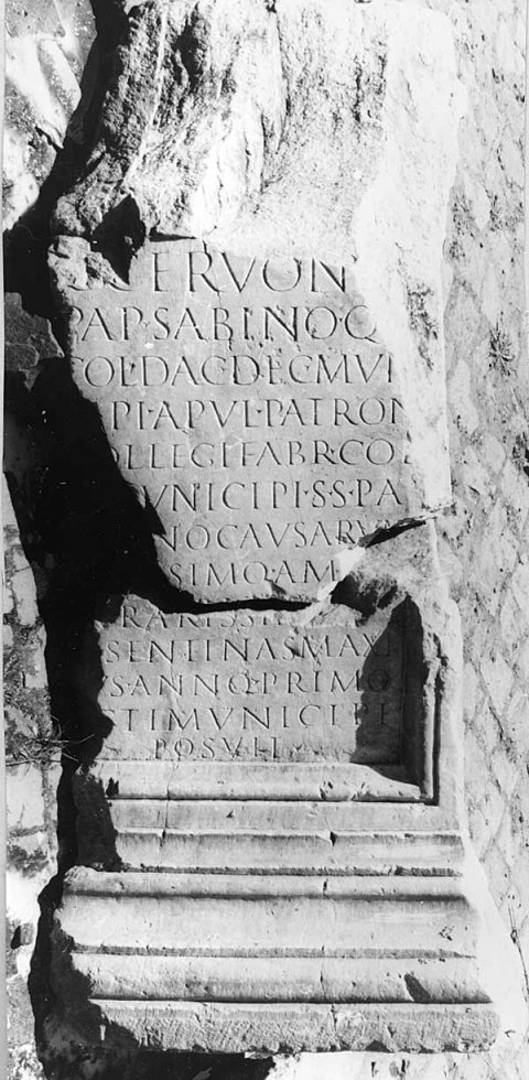 - C(aio) Cervoni[o] / Pap(iria) Sabino q(uin)[q(uennali)] / col(oniae) Dac(icae) dec(urioni) mun[i]/[c]ipi(i) Apul(ensis) / patron(o) / [c]ollegi(i) fabr(um) col(oniae) / [et m]unicipi(i) s(upra) s(criptorum) pa/[tro]no causarum / [?piis]simo am[ico] / rarissim[o] / Sex(tus) Sentinas Maxi/mus anno primo / [f]acti municipi(i) / posuit // [Ob] cuius / [sta]tuae dedi/[cat]ionem Lu/[ci]a Iulia uxor / [C]ervoni(i) per / omnes balne/[as] populo pu/blice oleum / posuit / l(oco) d(ato) d(ecurionum) d(ecreto)
