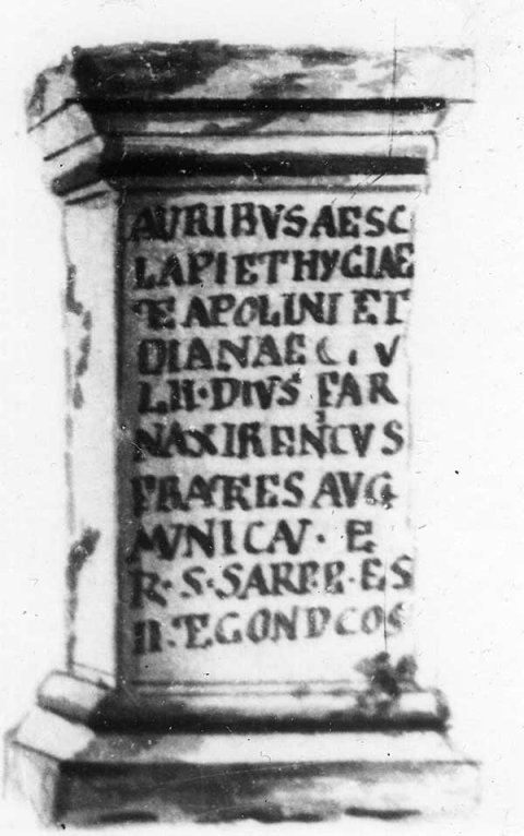 - Auribus Aesc[u]/lapi(i) et Hygiae / et Apollini et / Dianae C(aii) Iu/lii Dius Far/nax Irenicus / fratres Aug(ustales) / munic(ipii) Aur(elii) Ap(u)li / p(ro) s(alute) s(ua) p(osuerunt) Pr(a)es(ente) / II et Condi(ano) co(n)s(ulibus)