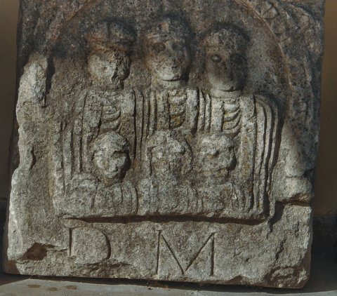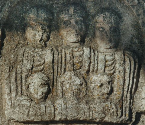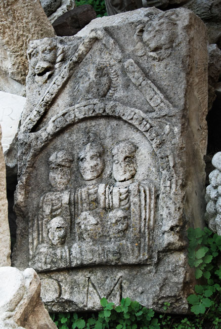 - Eingeschriebener Giebel, auf der Rahmenleiste Blattkyma, im Giebelfeld Gorgoneion, in den Eckzwickeln Löwenköpfe. Die untere Rahmenleiste des Giebels wird von einem Rundbogen mit Blattkyma überschnitten. Im Bogenfeld Brustbilder einer Familie (drei Erwachsene, davor drei Kinder).