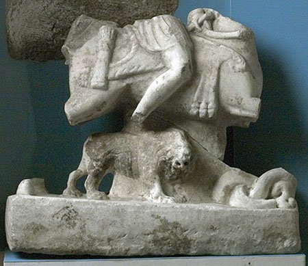 - Mythische Figur: nach rechts galoppierender Thrakischer Reiter, sitzt auf einem über den Pferderücken gelegten Pantherfell. Hinter ihm hängt Köcher mit Pfeilen. Unter dem Pferd Stütze, davor gehender Löwe, unter den Vorderbeinen des Pferdes Schlange. Rückseite summarisch ausgeführt.