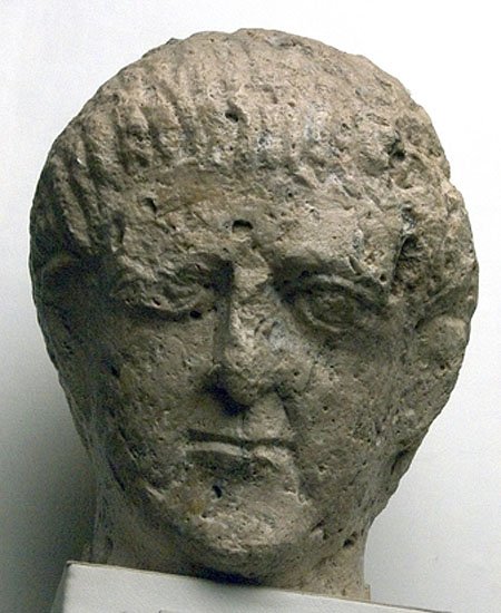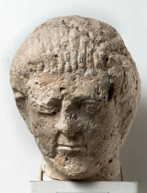 - Kopf eines bartlosen Mannes mit gesträhntemem, in die Stirn gekämmtem Haar