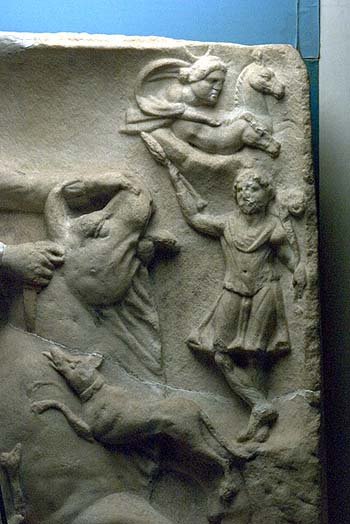 - Mythos (Mithras): Stiertötungs-Szene (Tauroktonie) zwischen Cautopates und Cautes, oben links Sol und Rabe, rechts Luna.