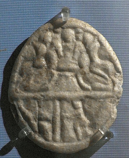- Mythische Figur (sogen. Donaureiter): kleine ovale Plakette, horizontal in zwei Felder geteilt. Oben Göttin zwischen zwei Reitern, unten zwei Figuren ?