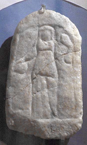 - Mythische Figur (Göttin, Juno ?): kleine, oben abgerundete Platte mit glatter Rahmenleiste. Frontal stehenden weibliche Figur mit langem, hochgegürtetem Chiton mit Überschlag, in der gesenkten Rechten Schale, in der Linken Szepter ?