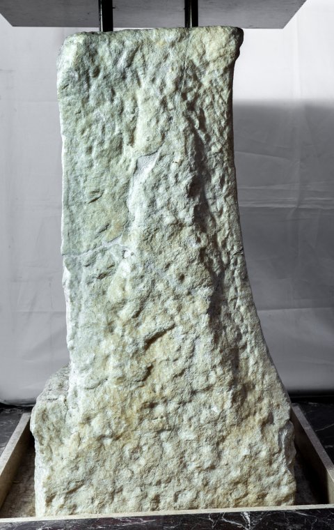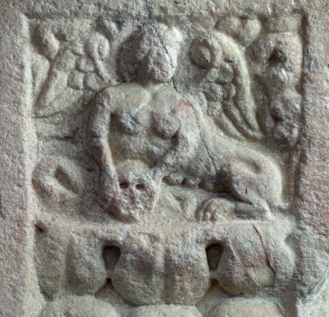 Auf der Vorderseite mythische Figur : über Akanthuskelch mit Blattschirm hockende Sphinx mit Menschenschädel in den Pranken.
