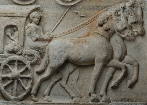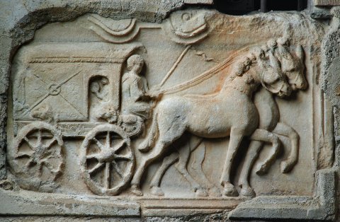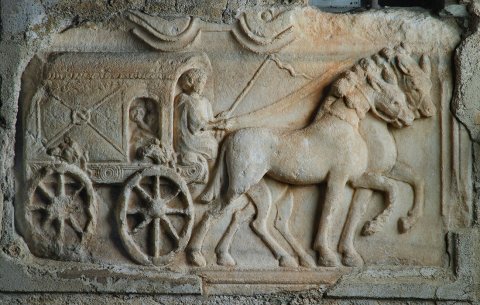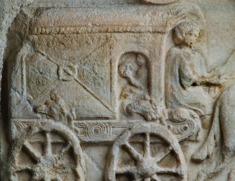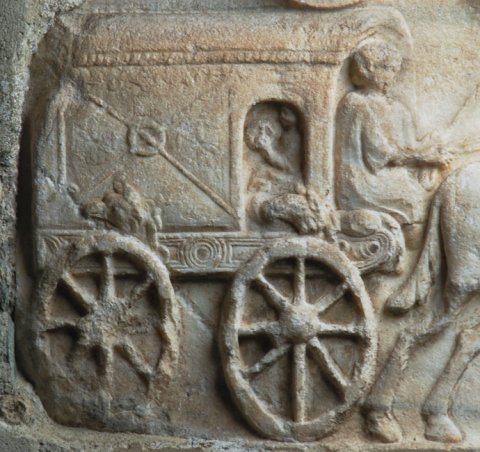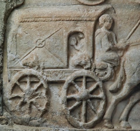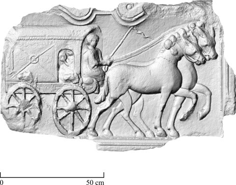 - Wagenszene: Rechteckfeld mit zweifach geschwungenem oberen Rahmen. Vierrädriger Planwagen mit Zweigespann, Kutscher mit Kapuzenmantel und Peitsche, in der mit Rosetten verzierten Plane rundbogige Öffnung, durch die man eine sitzende Frau mit rundem Gegenstand in der Hand (Fächer ?) sieht. Auf dem Rand des Wagenkastens Greifenköpfe.