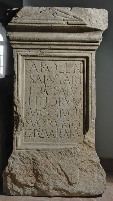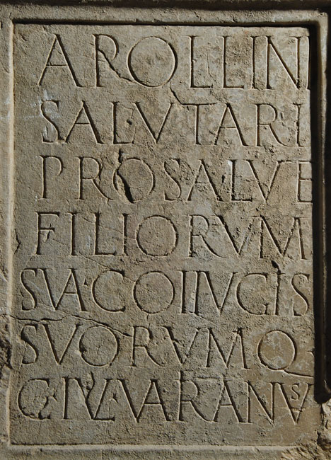 - Apollini / salutari / pro salute / filiorum / sua coi{i}ugis / suorumq(ue) / C(aius) Iul(ius) Varianus