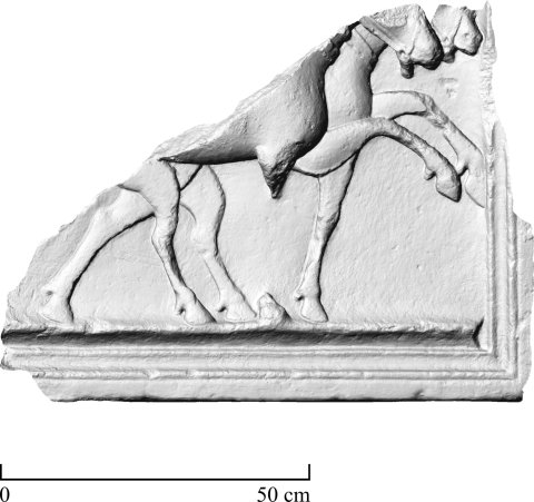 - Wagenszene: nach rechts ausschreitendes Pferdegespann
