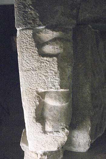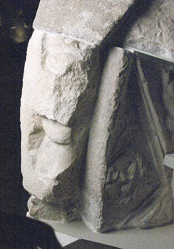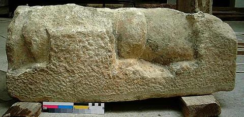 - Reste der Körper von zwei liegenden Löwen, zwischen ihnen abgeschlagenes Relief.