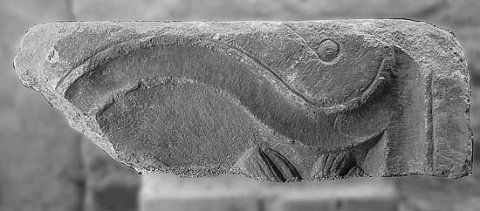 - Rest des rechten Seitenfeldes einer Sarkophagfrontseite. Bogenrahmen mit Volutenenden, darunter Reliefrest.