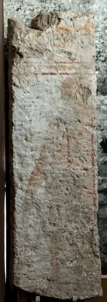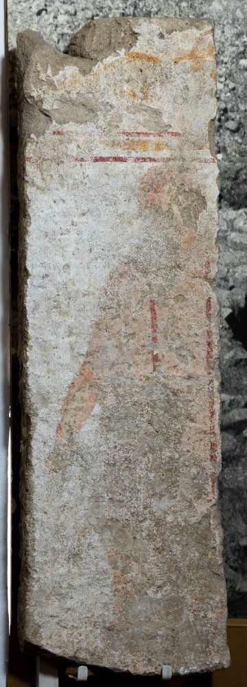 - Stehender Mann (Diener ?) in Tunica mit zwei roten Streifen, rechts Arm gesenkt. Über der Figur Rahmen aus drei Streifen, darüber Spuren von gemaltem Ornament.