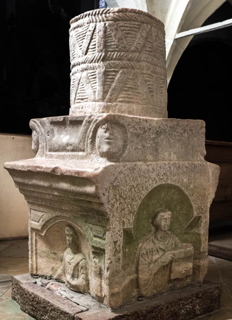 Auf der rechten Nebenseite in Bogennische Mann: bärtig, Ärmeltunica, Mantel, rechts neben ihm aufgehängter großer Behälter. Namensbeischrift: Attianus.