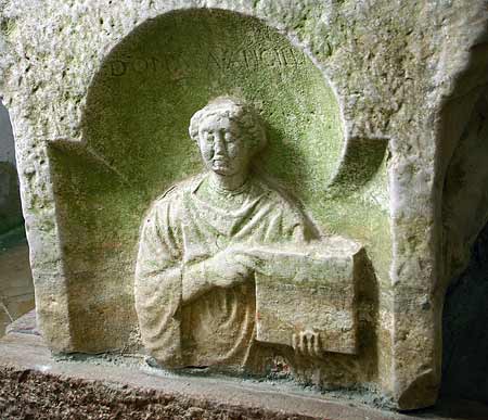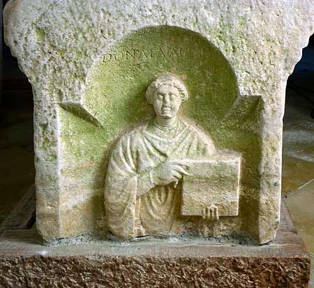 Auf der linken Nebenseite in Giebelnische Frau (Dienerin), in der Rechten Fächer. Namensbeischrift angeblich Donat/ianus / libertus (?).