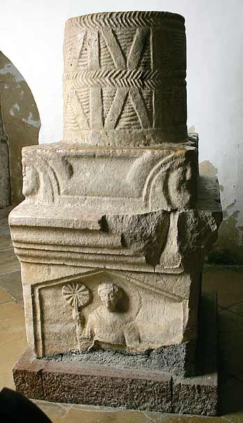 Als Bekrönung eckiger Aufsatz mit Masken als Eckakrotere, darauf runde geflochtene Ciste.
