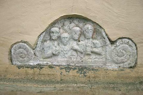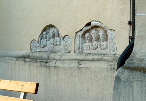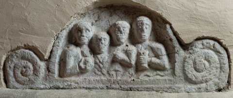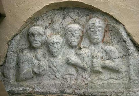 - Familie: in Bogennische mit seitlichen Voluten (pulvini) vier Brustbilder, drei halten Attribute.