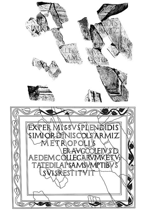- Ex permiss[u] spl[e]ndidis/simi ordi[nis c]ol(oniae) Sarmiz(egetusae) / m[e]tr[opo]lis / [---]er Aug(ustalis) [co]l(oniae) eiusd(em) / [aedem co]llegarum v[e]tus/[tate dilap]sam s[u]mptib[us] / suis re[s]titu[it]