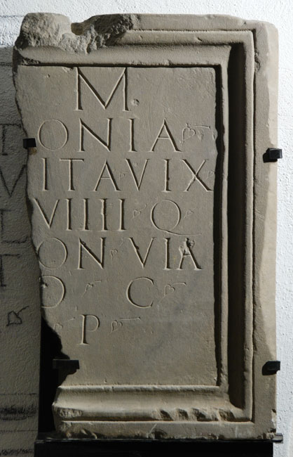 - [D(is)] M(anibus) / [Ant]onia / [?Bon]ita vix(it) / [an(nis) L]VIIII Q(uintus) / [Ant]on(ius) Via/[tor] d(ecurio) c(oloniae) / [b(ene) m(erenti)] p(osuit)