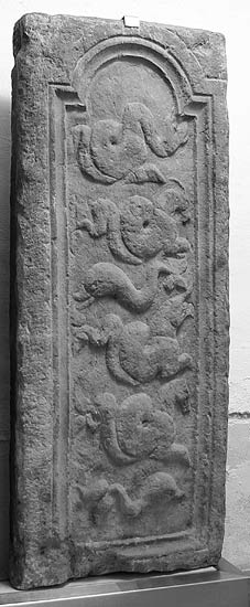 - In hochrechteckigem Feld mit Bogenabschluss sechs Meerwesen übereinander.