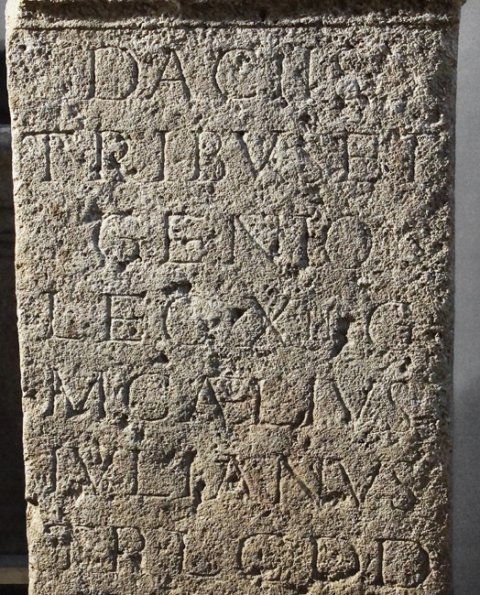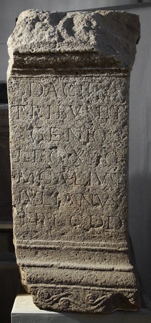 - Daciis/ tribus et/ Genio/ leg(ionis) XIII G(eminae)/ M(arcus) Caelius/ Iulianus/ tr(ibunus) l(ati)c(lavius) d(onum) d(edit).
