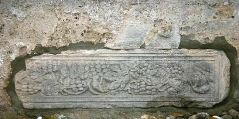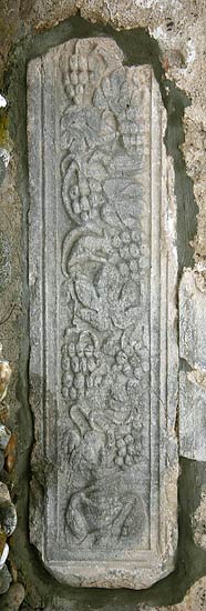 - Tiere: schmales Bildfeld mit Gefäß zwischen zwei Vögeln, aus dem Weinranke wächst. In der Ranke ein Eichhörnchen und zwei Vögel.