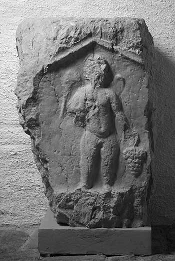 Auf der linken Nebenseite Bildfeld mit Giebel, darin Reliefrest (Ornament ?).
