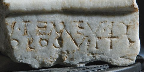- Mythische Figur (Diana): Unterkörper einer nach links ausschreitenden Frau im kurzern Chiton, neben dem rechten Bein aufblickender Hund.