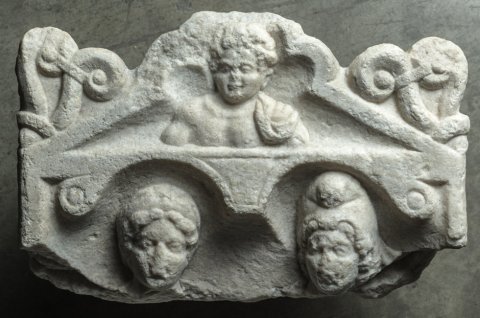 - Mythische Figuren (Magna Mater, Attis): Giebel mit Palmetten-Eckakroteren, Giebelspitze muschelförmig, im Giebelfeld Büste eines bartlosen Mannes im Brustpanzer, Mantelbausch auf der linken Schulter. Unterhalb des Giebels Doppelbogen mit Volutenenden, unter dem linken Bogen Frauenkopf mit Diadem, im rechten Kopf mit phrygischer Mütze.