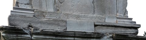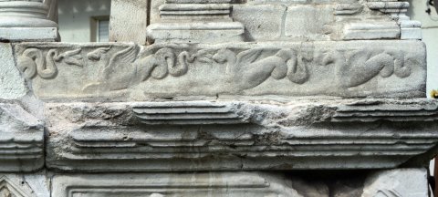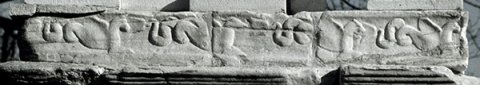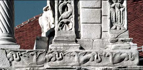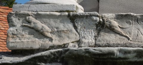 - Basisplatte des Aedicula-Geschosses. Auf der Vorderseite jagende Tiere und nachträglich eingefügtes Schriftfeld. Auf den Nebenseiten Meerwesenfriese (Seegreife, Seepanther).