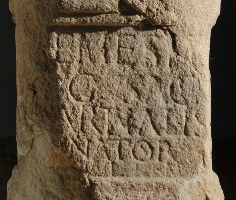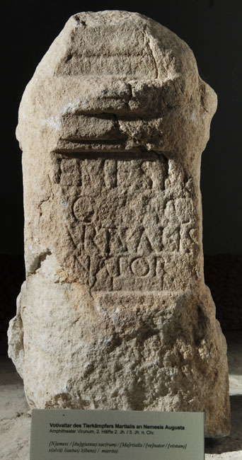- [N]emesi / [Au]g(ustae) sac(rum) / [M]artialis / [ve]nator / [v(otum)] s(olvit) l(aetus) l(ibens) / m(erito)