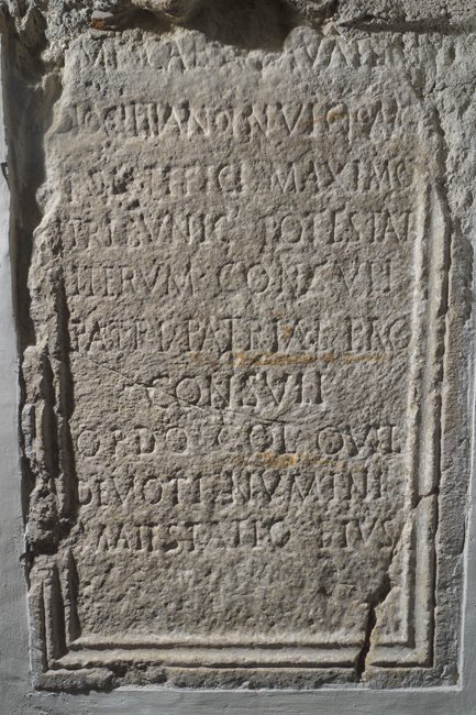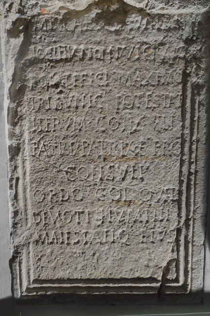 - Imp(eratori) Caes(ari) [ C(aio) Aur(elio) ] Valer(iano) / Diocletiano invicto Aug(usto) / pontifici maximo / tribunic(ia) potestat(e) / iterum consuli / patri patriae pro/consuli / ordo col(oniae) Ovil(avensium) / devoti(!) numini / maiestatiq(ue) eius