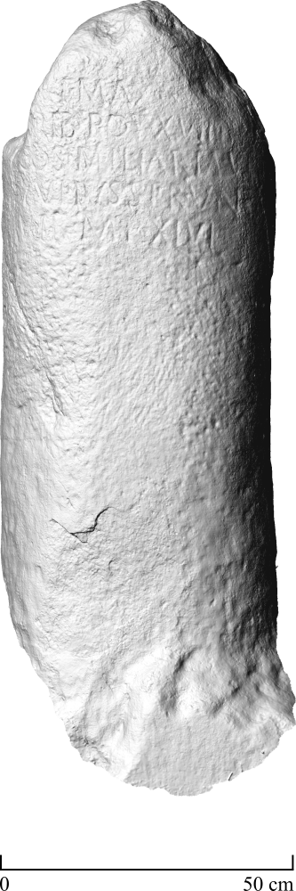 - [Imp(erator) Caesar L(ucius) Septimius Severus] / [Pius Pertinax Aug(ustus)] / [Arab(icus) Adiab(enicus) Part(hicus) max(imus)] / [pont(ifex) max(imus) trib(unicia) pot(estate) VIII] / [imp(erator) XII p(ater) p(atriae) co(n)s(ul) II proco(n)s(ul)] / [et Imp(erator) Caes(ar) Mar(cus) Aur(elius)] / [Anton(inus)] Piu[s Felix Aug(ustus)] / [P]art(hicus) max(imus) [Germ(anicus) max(imus)] / trib(unicia) pot(estate) XVII i[mp(erator) III pro]/co(n)s(ul) miliaria v[et(ustate) collapsa resti]/tui iusserunt / [a] Vir(uno) m(ilia) p(assuum) XLVI