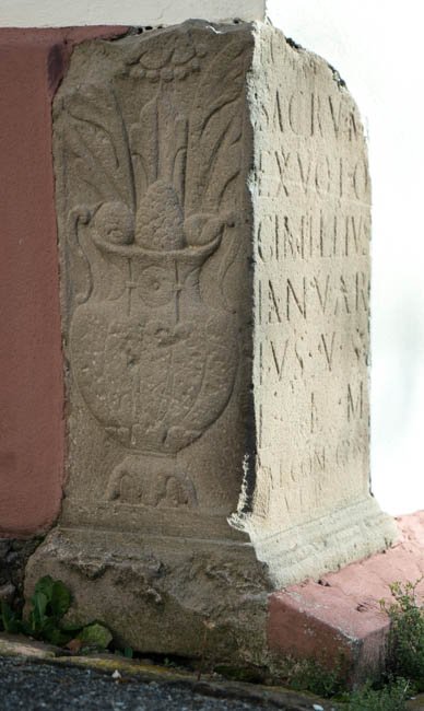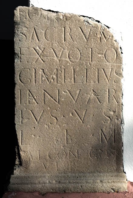 - Fort[unae] / sacrum / ex voto / Gimillius / Ianuar/ius v(otum) s(olvit) / l(ibens) l(aetus) m(erito) / Falcone co(n)s{s}/ule