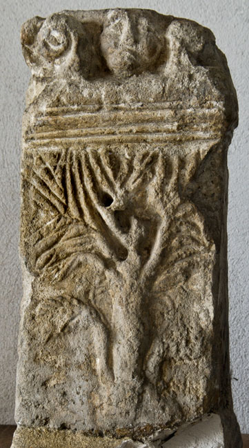 Altaraufsatz mit Voluten (pulvini), dazwischen jugendliches Gesicht.