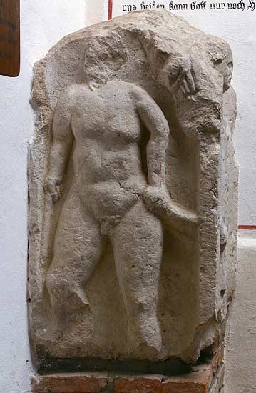 - oberer Rand verbr., unten abgebr., Füße der Figuren u. Kopf des unbekleideten Mannes fehlen; nach Mitteil. von W. Eckl, Laufen, rezente Beschädigung der linken Hand (Attribut weggebrochen)