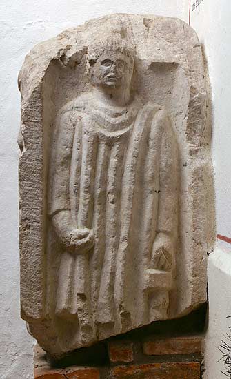 Auf der rechten Nebenseite Diener (Sciba ?): Mann mit kurzer Ärmeltunica und auf der rechten Schulter zusammengehaltenem Mantel, zusammengeklappte Schreibtafel in der Linken.