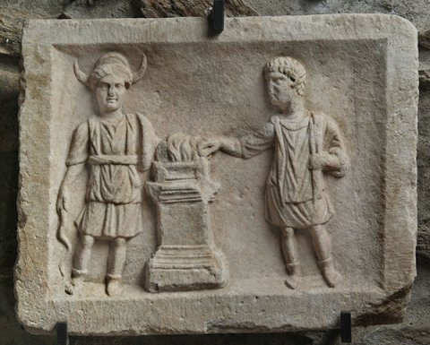 - Mythische Figur : links stehende Nemesis mit Diadem und Mondsichel auf dem Kopf, Peitsche und Schild, in der Mitte Altar, rechts Mann in Stiefeln, Ärmeltunica und Sagum, mappa über der Schulter, opfert am Altar.