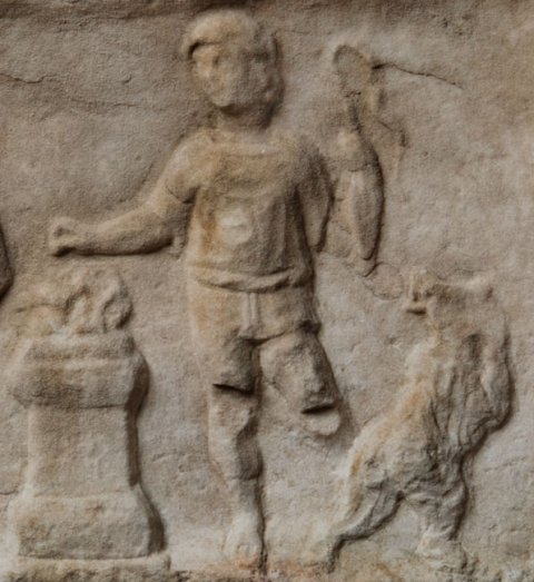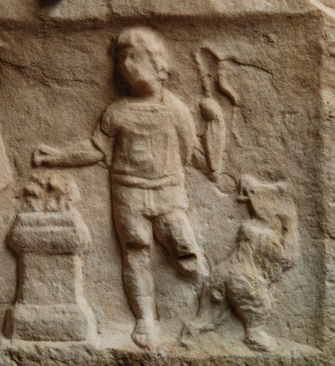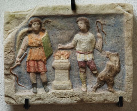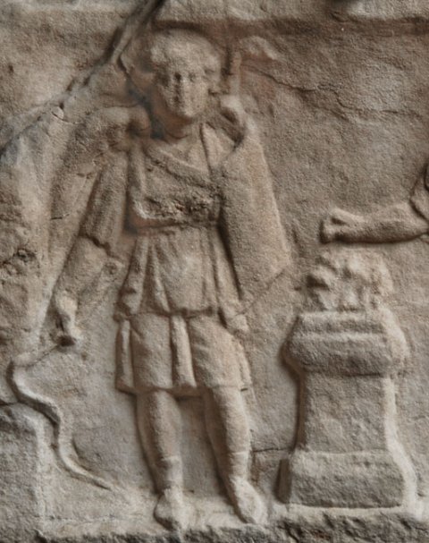 - Mythische Figur, Tier : links stehende Nemesis mit Peitsche und Schild, in der Mitte Altar, rechts Mann (bestiarius), der einen Bären führt.