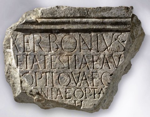 - [Se]x[tus] Erbonius [--- vivus) f(ecit)] / [sib]i et Atestiae AV[---] / [con(iugi)] opti(mae) quae o[biit ? ---] / [et Erb]oniae Opta[tae fil(iae) ? ---] / [h(oc) m(onumentum)] h(eredem) [n(on) s(equetur)]