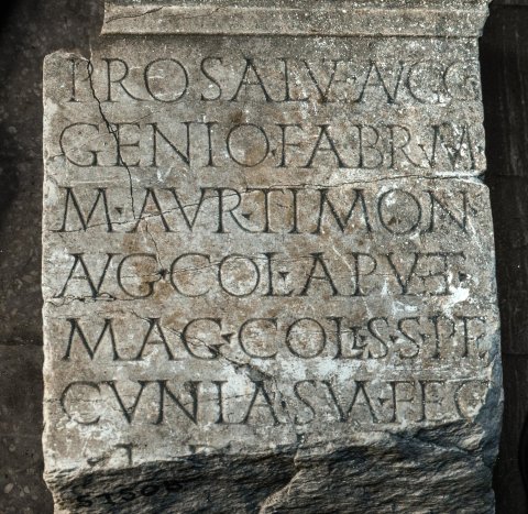 - Pro salute Auggg(ustorum) / Genio fabrum / M(arcus) Aur(elius) Timon / Aug(ustalis) col(oniae) Apul(ensis) et / mag(ister) coll(egii) s(upra) s(cripti) pe/cunia sua fec(it) / l(oco) d(ato) d(ecurionum) d(ecreto)