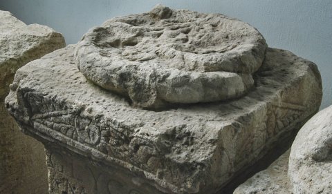 - Aufsatz auf drei Seiten mit Giebel mit Rosette zwischen Blättern. Auf der Oberseite liegende eingerollte Schlange.