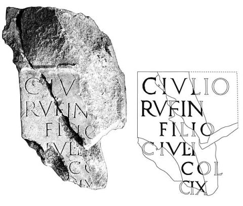 - C(aio) Iul[io] / Rufin[o] / filio / C(ai) Iul(ius) I?[---] / [---] co[ll(egii)?] / [de]c(uriae?) IX[---] / [---