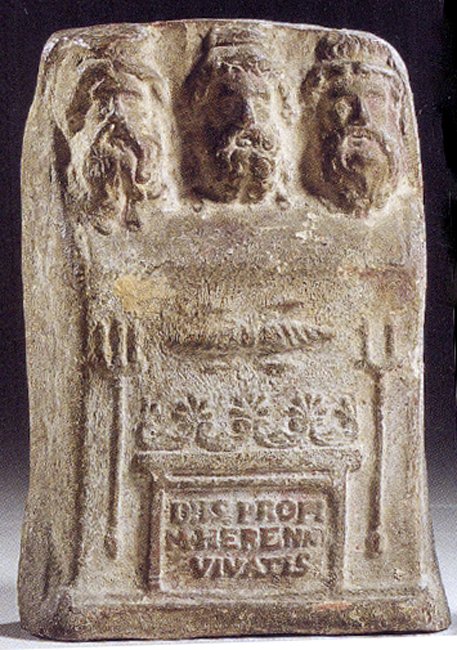 - Mythische Figuren : Relief aus gebrannten Ton, oben drei männliche Köpfe (Neptun, Jupiter, Nereus ?) darstellend, darunter Dreizack, Blitzbündel, Zweizack. Schriftfeld in Form eines Altars mit Palmettenaufsatz.