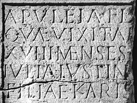- D(is) [M(anibus)] // Apuleia Fl[---] / quae vixit an[nos] / XVIII menses [---] / Iulia Iustin[iana] / filiae karis[simae f(aciendum) c(uravit) ?]