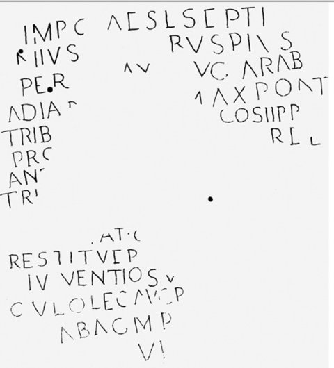 - Imp(erator) Caes(ar) L(ucius) Septi/mius [Seve]rus Pius / Per[tin]ax [A]ug(ustus) Arab(icus) / Adiab(enicus) [Parth(icus)] max(imus) pont(ifex) [max(imus)] / trib(unicia) p[ot(estate) XVI imp(erator) XII] co(n)s(ul) II p(ater) p(atriae) / pro[co(n)s(ul) et Imp(erator) Caes(ar) M(arcus) Au]rel(ius) / Ant[oninus Pius Aug(ustus)] / tri[b(unicia) pot(estate) IIII proco(n)s(ul) et] / [[[P(ublius) Sept(imius) Geta nob(ilissimus) Caes(ar)]]] / [miliaria vetust]at(e) [conlapsa] / restitueru[nt curante] / [M(arco)] Iuventio Sur[o Pro]/culo leg(ato) Aug(usti) p[r(o) pr(aetore)] / ab Ag(unto) m(ilia) p(assuum) / VI