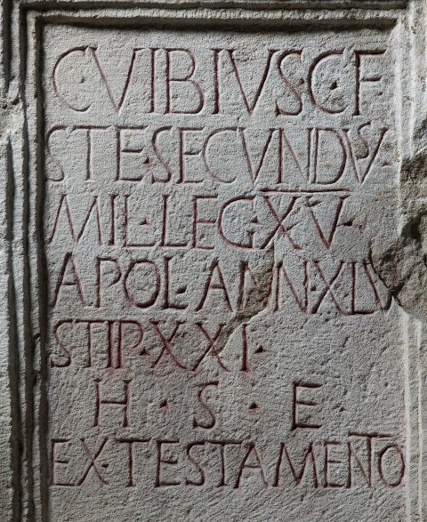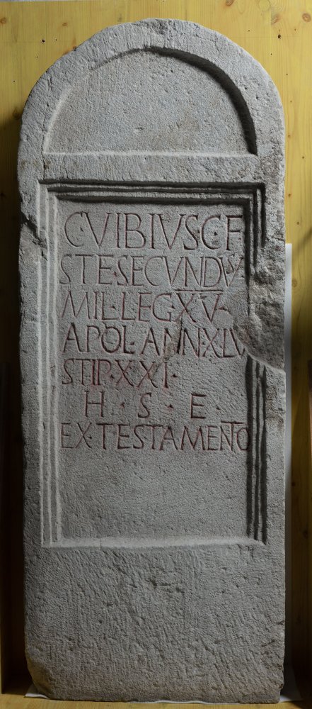 - C(aius) Vibius C(aii) f(ilius) / Ste(llatina) Secundus / mil(es) leg(ionis) XV / Apol(linaris) an(norum) XLV / stip(endiorum) XXI / h(ic) s(itus) e(st) / ex testamento