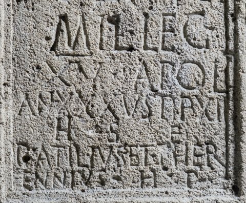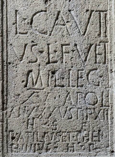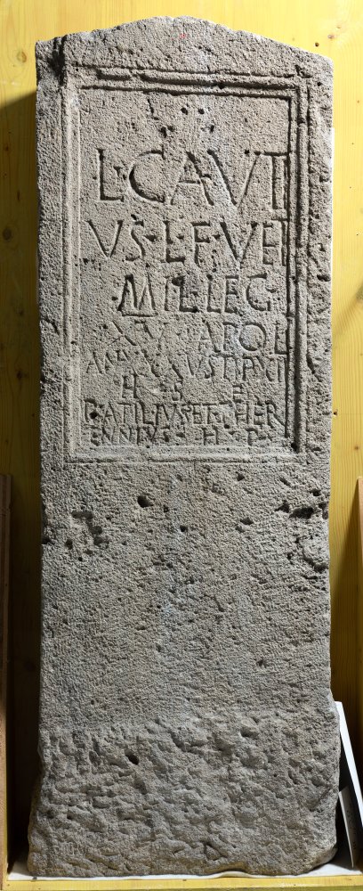 - L(ucius) Cauti/us L(ucii) f(ilius) Vet(uria) / mil(es) leg(ionis) / XV Apol(linaris) / an(norum) XXXV stip(endiorum) XIIX / h(ic) s(itus) e(st) / P(ublius) Atilius et T(itus) Her/ennius h(eredes) p(osuerunt)