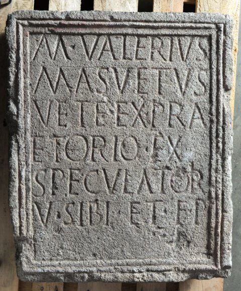 - M(arcus) Valerius / Ma(n)suetus / vete(ranus) ex pra/etorio ex / speculatori(!) / v(ivus) sibi et f(iliis?) p(osuit)
