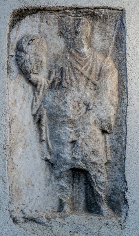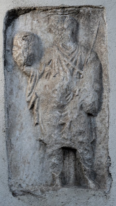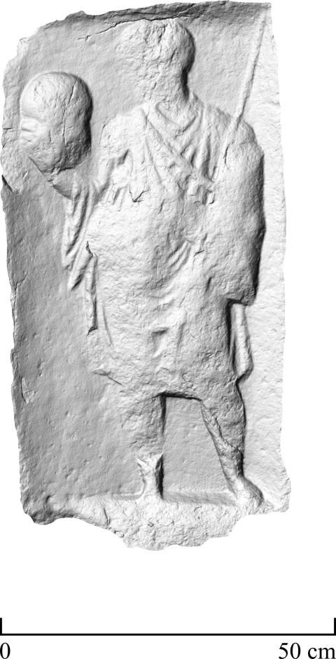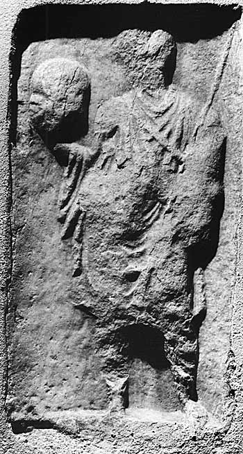 - Mann (Soldat ? oder Diener ?): auf flachem Podest Mann in kurzer Tunica und Mantel. Waffen: in der Rechten Helm, im linken Arm Speer, am Oberarm Rundschild.