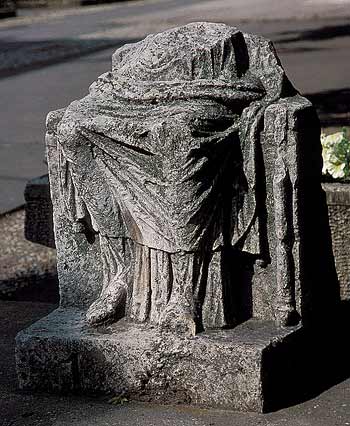 - Mythische Figur (Juno ?): Auf kastenförmigem Thron mit niedrigen Armlehnen sitzende Göttin in Chiton und Mantel. An der Thronvorderseite unterhalb des linken Armes Rest eines Szepters.